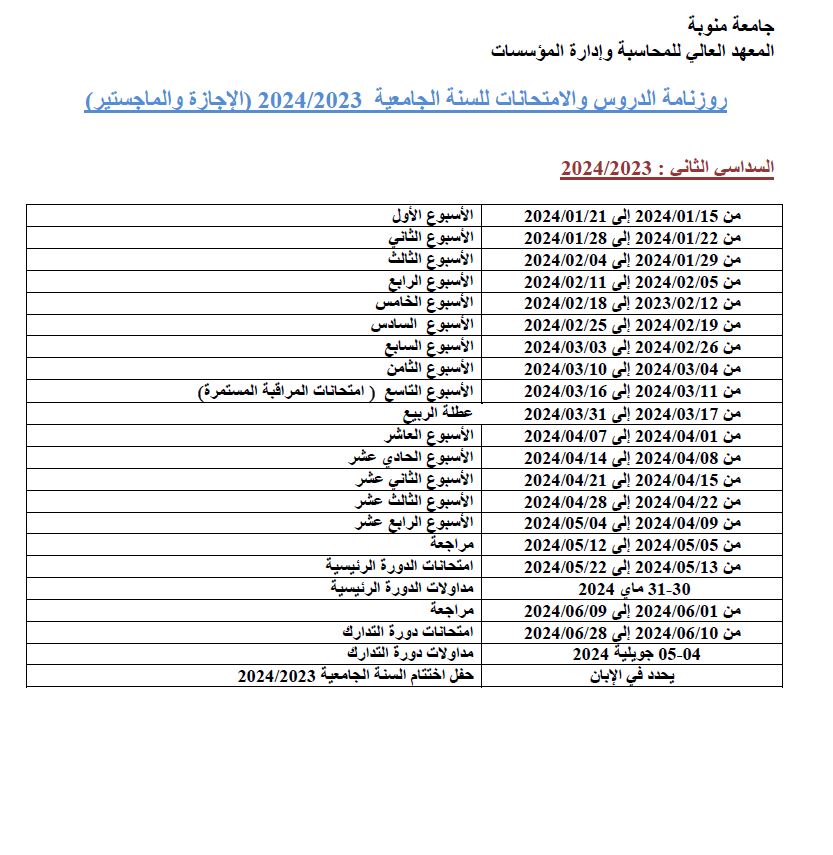 Calendrier du Semestre 2 - AU:2023-2024