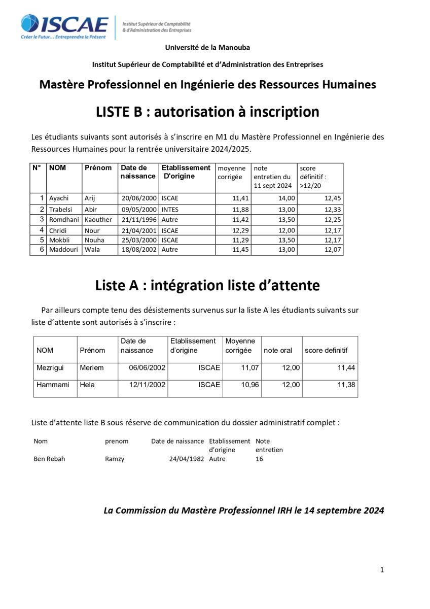 Mastère Professionnel en Ingénierie des Ressources Humaines LISTE B : autorisation à inscription