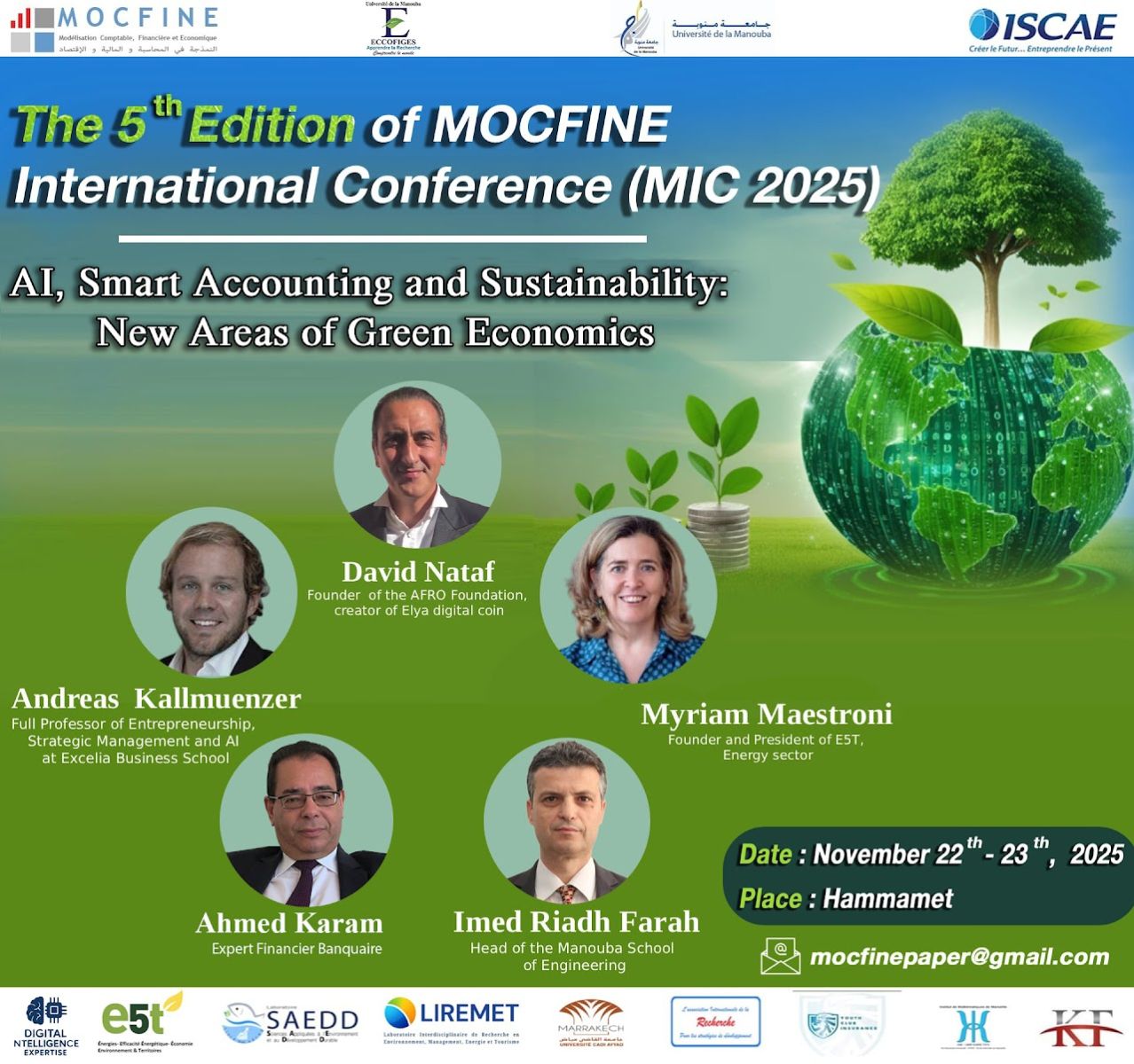 Nous avons le plaisir de vous annoncer l'organisation de la 5ème Édition de la conférence internationale de MOCFINE intitulée "AI, Smart Accounting and Sustainability: New Areas of Green Economics", qui se tiendra les 22 et 23 novembre 2025 à Hammamet, Tunisie.